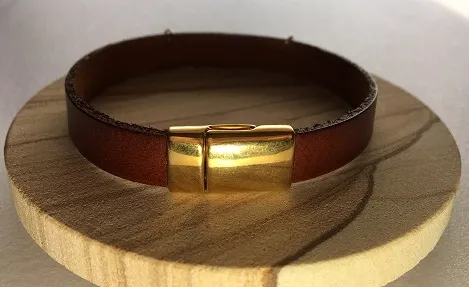 The bracelet is a brown leather 10mm wide strap that fastens with a matching gold high quality 4-pronged magnetic clasp.
