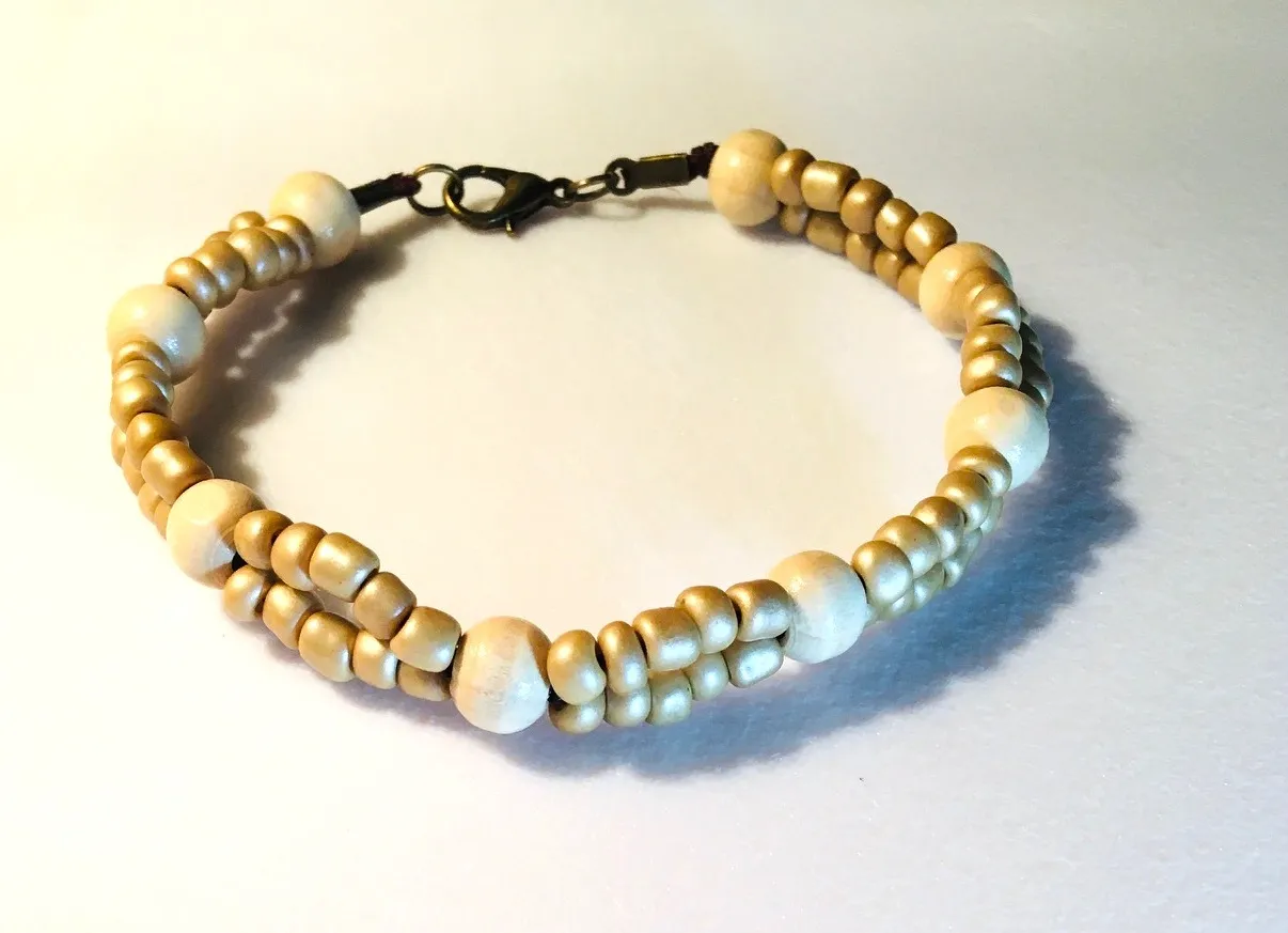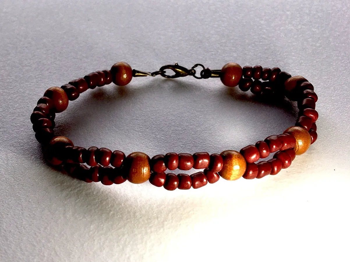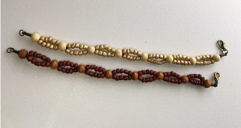 These beaded bracelets are composed of 2 strands of ceramic beads separated in groups by larger wooden beads with bronze lobster clasps.