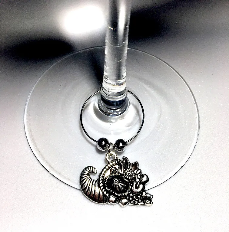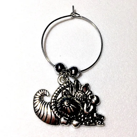 These very hearty 1" wide silver tone cornucopia wine glass charms with silver accent beads start with sets of 4 and can be expanded up to a seating for 10.